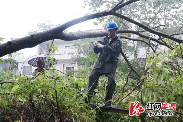 抢修时,由于现场地理环境复杂,线路设备受损情况比较严重,且倒下的大树长达10余米,清理难度较大,给抢修人员造成了极大困难。为了尽快抢修复电,工作人员穿上雨衣,立即投入到紧张的抢修工作中,进行停电、验电、挂接地线、拆除旧导线、更换新导线等操作,前来查看抢修情况的村民也都陆续投入到抢修队伍,帮助清理现场断木和树叶,经过抢修工作人员近5个小时的奋力抢修,下午13时26分,砂干铺重新恢复送电。当天下午,娄星区所有受损线路也已全部恢复送电。