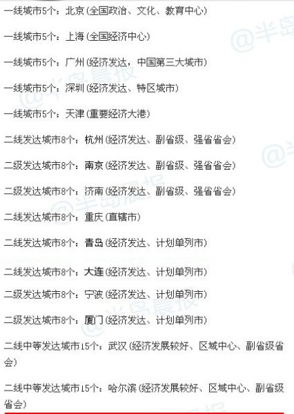 刘瑞告诉记者,现在网络上流行的各类城市排名榜多是某个领域的内部行为,基本是以城市商品房价格为重要指标。其实,从现在的情况看,大致分为三类,一类是以行政级别划分,比如,直辖市都是一线城市; 副省级城市、计划单列市、省会城市等算二线城市;三线城市是指经济比较发达的中小城市。