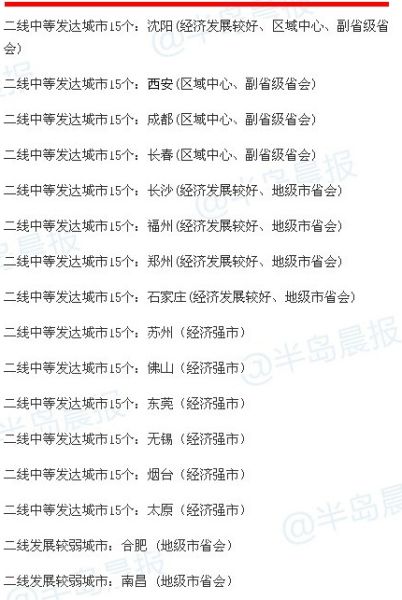 副省级市是中华人民共和国的行政区名之一,受省级行政区管辖,副省级市的市长与副省长行政级别相同。副省级市与一般城市的区别,主要体现为国民经济与社会发展计划方面,国务院等主管部门将副省级市视为省一级计。还有一类是按人口规模分,比如,人口规模达到1000万人以上的算一线城市;800-500万人的算二线城市;500-200万人的算三线城市等。另外,就是以城市房价为标准评价。“不过,这些都较为片面,如果真想进行权威评价,城市的综合经济实力、发展潜力、人口规模、行政级别等都是‘杠杠’。”刘瑞对记者说。