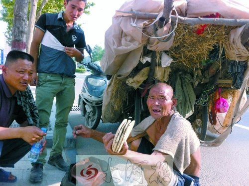 据老人介绍,他叫张学武(音),今年68岁,是新郑市龙湖镇翟家寨村人,膝下没有儿女。两个胞弟,都成家了。6月16日早上,他把承包的责任田里收割过后的麦秸装上架子车,想拉到原阳县一造纸厂销售,“麦秸有100公斤,每公斤5毛钱。一个人除了填饱肚子,基本上不花啥钱。年龄大就会得病,手里得有点钱。”