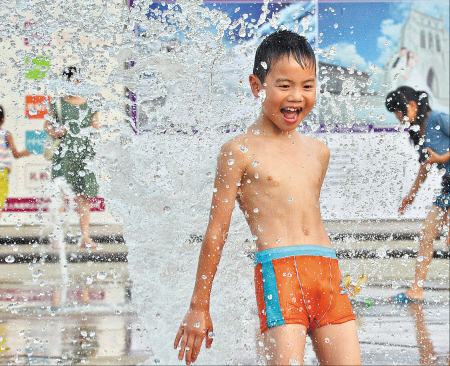 昨日长沙酷热难当。下午5时,芙蓉区婚庆公园广场,孩子们在喷泉边戏水玩耍消暑。陈飞 摄
