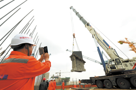 长沙晚报10月16日讯(石祯专 陈庆芳 运文学 摄影报道) 昨日上午10时多,在繁忙的湘江长沙综合枢纽工程三期建设工地现场,一台400吨级吊车将电站1#机组管形座下立柱顺利吊装就位,标志着湘江枢纽工程三期1#水轮发电机组管型座安装正式开始,为明年4月底主机正式安装打下基础。