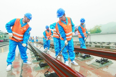 有望明年建成通车的沪昆客专湖南段,站前线下工程目前已基本完成,轨道道床及各配套工程正在全面推进。在芷江北站铺轨基地,铁路建设工人们正在雨中奋力作业,铺设无砟轨道,正线首根500米长轨徐徐落位、顺利铺设。芷江基地承担了单线371公里的铺轨任务,湖南段娄底、杭长铺轨基地今天也同步展开工作。