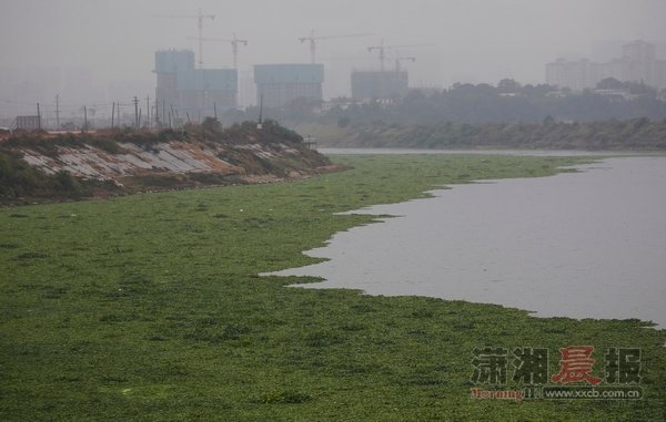 绿油油的水葫芦蔓延了一两公里,上游不断有水葫芦漂下。水葫芦在捞刀河回水湾处聚集,大有侵占整个水面的趋势。