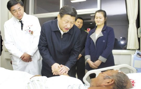 24日下午,习近平一抵达青岛,就来到青岛大学附属医院黄岛分院,看望慰问伤员、医护人员和遇难者家属。他走进病房,来到受伤群众病床前,仔细查看伤情,鼓励他们配合治疗、安心养病。习近平同医疗专家代表一一握手,肯定他们关键时刻迅速行动、连续作战、不怕疲劳的救死扶伤精神,希望他们劳逸结合、科学调度、再接再厉,确保每个伤员都得到精心治疗。他要求有关部门要一家一家把善后工作做细做实。