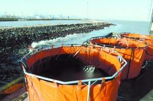 11月27日,在黄岛油港码头附近堤坝上,轻便储油罐存储了大量已清理的油污。目前海上浮油得到了有效控制。 新华社发