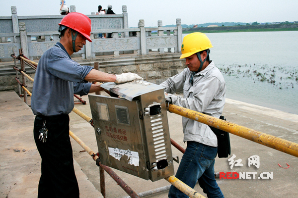 为保证端午活动的双电源可靠供电,5月24日一大早,汨罗公司计量班班长蒋金辉就带着班里的成员,来到了龙舟看台,经过现场查勘后了解到,原有250kVA的变压器供电容量远远不能满足端午节活动的需要,就利用附近一台630kVA的变压器做临时电源,到主席台、舞台、发播台、庙会等9个活动点,开始布线,装设开关,配合原有变压器。