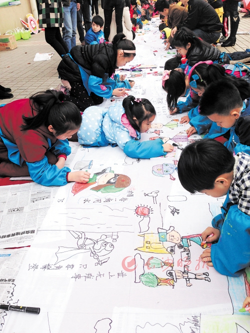 3月是学雷锋月,昨日又恰逢第23个世界水日,芙蓉区火星街道陶家山社区组织社区内在职党员,向辖区内的幼儿园和小学的学生们讲雷锋故事,宣传节水观念。300多名学生还以学雷锋和节水为主题,在200米长卷上展开绘画创作。图为一名小学生在画卷上把“雷锋叔叔”和节约用水画在同一画面中,取名为“请珍惜每一滴水”。