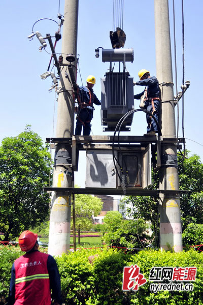 红网娄底4月15日讯(通讯员 徐巍巍 张娟)14日下午2点,国网娄底供电检修公司配电室抢修班顺利完成了10千伏仙桥II线三角坪支03杆G044种子公司变压器更换、跌落保险至公变引线更换任务,确保了该辖区居民用上放心电。自3月以来,为做好春检工作,确保电网设备安全,娄底供电检修公司配电室对城区100余台变压器进行C类检修,于3月底对种子公司G044变压器进行例行试验,在试验中发现该变压器存在低压绕阻有过流现象,且低压绕阻三相阻值不平衡率已经超标,存在安全隐患。为确保设备稳定运行,不影响周边居民的正常用电,该公司配电室高度重视,组织精兵强将于4月14日对此变压器进行更换。
