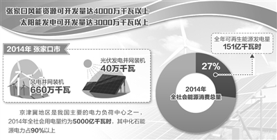 同时,京津冀地区巨大的能源消费需求,又为消纳这些可再生能源提供了可能。数据显示,京津冀地区是我国主要的电力负荷中心之一,2014年全社会用电量约为5000亿千瓦时,其中化石能源电力占90%以上。按照《国务院关于印发大气污染防治行动计划的通知》,京津冀地区要实现煤炭消费总量负增长,未来可再生能源发展需求迫切,这为示范区提供了巨大的市场空间。