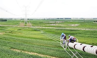 图为电力工人在施工现场工作。近日,由冀北秦皇岛供电公司承建的500千伏高岭-天马供电线路部分区段导线进行更换工程和昌乐双回500千伏线路工程秦皇岛段全部竣工。工程全部投产后,将大幅提高东北向华北电力输送能力。新华社记者 杨世尧 摄
