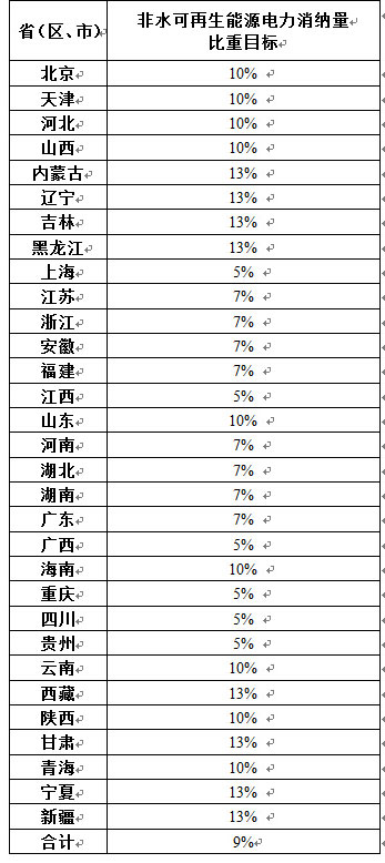 对于2020年各省(自治区、直辖市)行政区域全社会用电量中非水电可再生能源电力消纳量的最低比重指标,《指导意见》明确,北京、天津等地为10%,内蒙古和东三省等地为13%,江苏、浙江等地为7%,上海、四川、贵州等地为5%。合计全社会用电量中非水电可再生能源电力消纳量比重指标为9%。